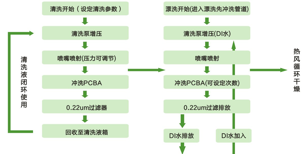 操作流程為:人工方式將PCBA放入清洗籃內;在觸摸屏上設定的清洗、漂洗、干燥程序和其它相關參數(shù)后;在觸摸屏上按“啟動”鍵,機器按設定程序對PCBA進行自動清洗、漂洗和干燥;當設定程序結束后機器自動停止運行,人工方式取出清洗籃內清洗好的PCBA。