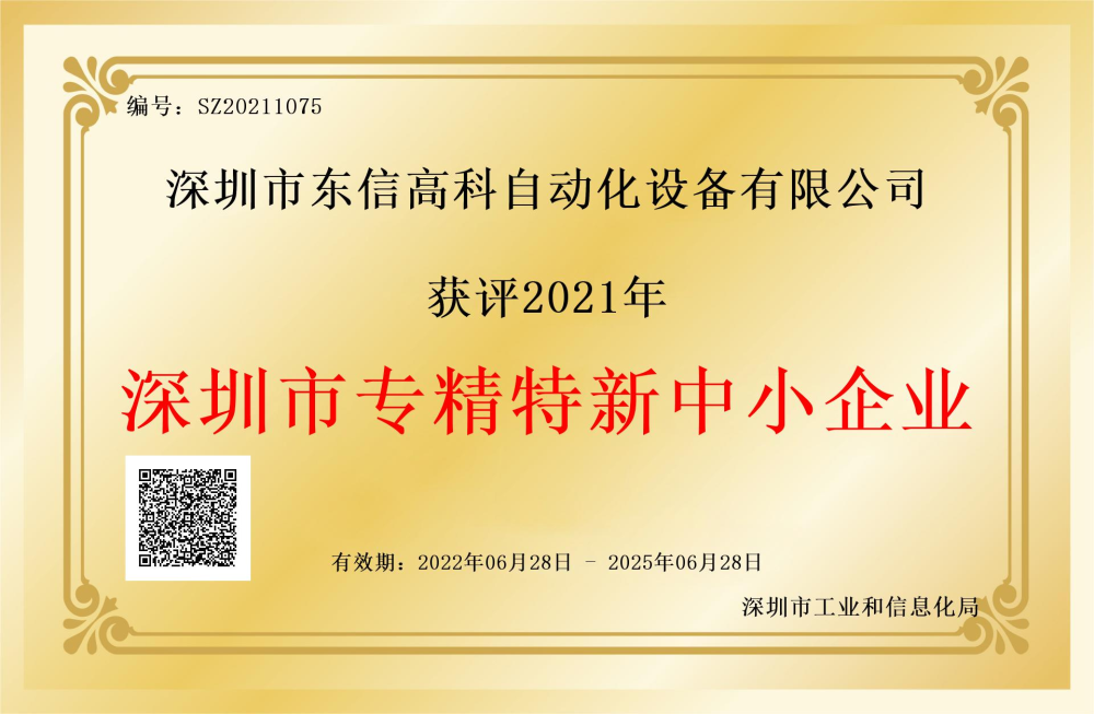 深圳市東信高科自動化設備有限公司獲評2021年深圳市專精特新中小企業(yè),證書有效期為2022年06月28日至2025年06月28日。